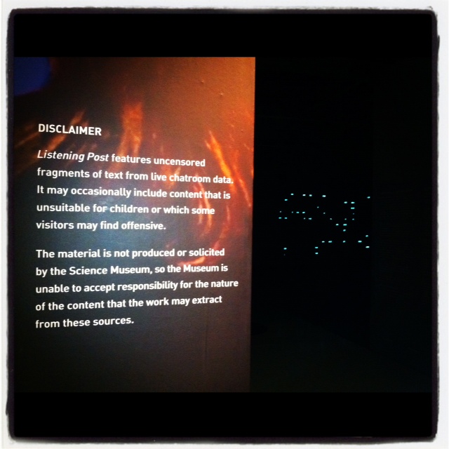 Listening Post (2003) is “a dynamic portrait of online communication, displaying uncensored fragments of text, sampled in real-time, from public internet chatrooms and bulletin boards”, according to the Science Museum website.